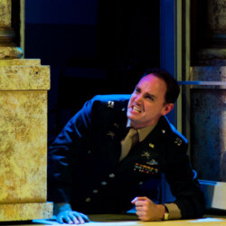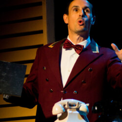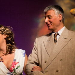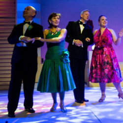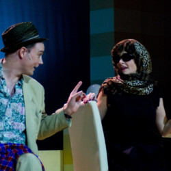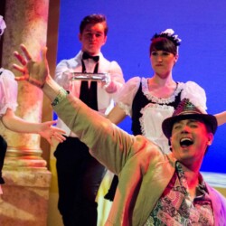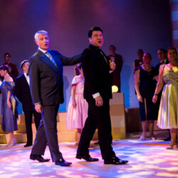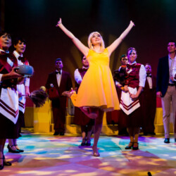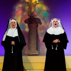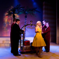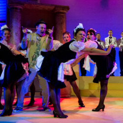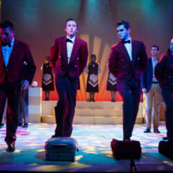 In Dirty Rotten Scoundrels, costumes playfully reflect the opulence and deception of the French Riviera. The suave, sharp suits worn by the charming con men contrast with the glamorous dresses of the wealthy women. The luxurious, eye-catching outfits highlight the show’s comedic tone and high society setting, adding to the wit and charm of this hilarious caper.